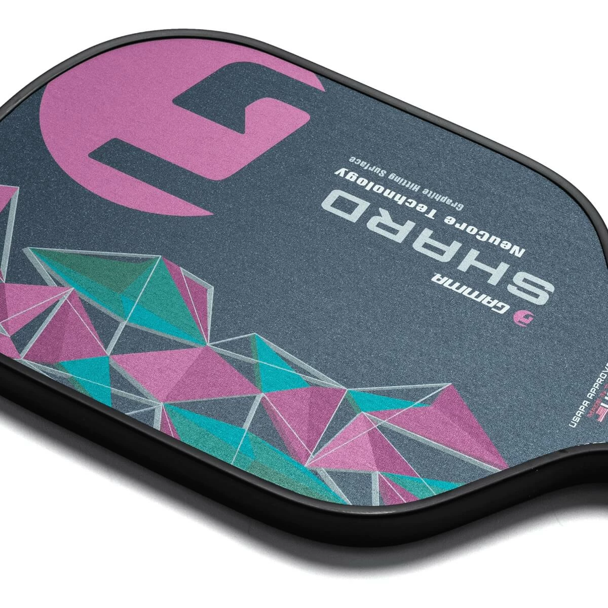 The GAMMA Shard is a graphite face pickleball paddle, which helps the players touch and gives the paddle a soft feel. The graphite face also helps keep the ball on the paddle longer and provides more spin on your shots. The Shard has a middleweight of 7.75 average oz. It is a great paddle for somebody looking to play for hours. The shard has a power that helps keep a ball in play and allows you to still put the shot away. The larger paddle cells help keep the paddle quiet.