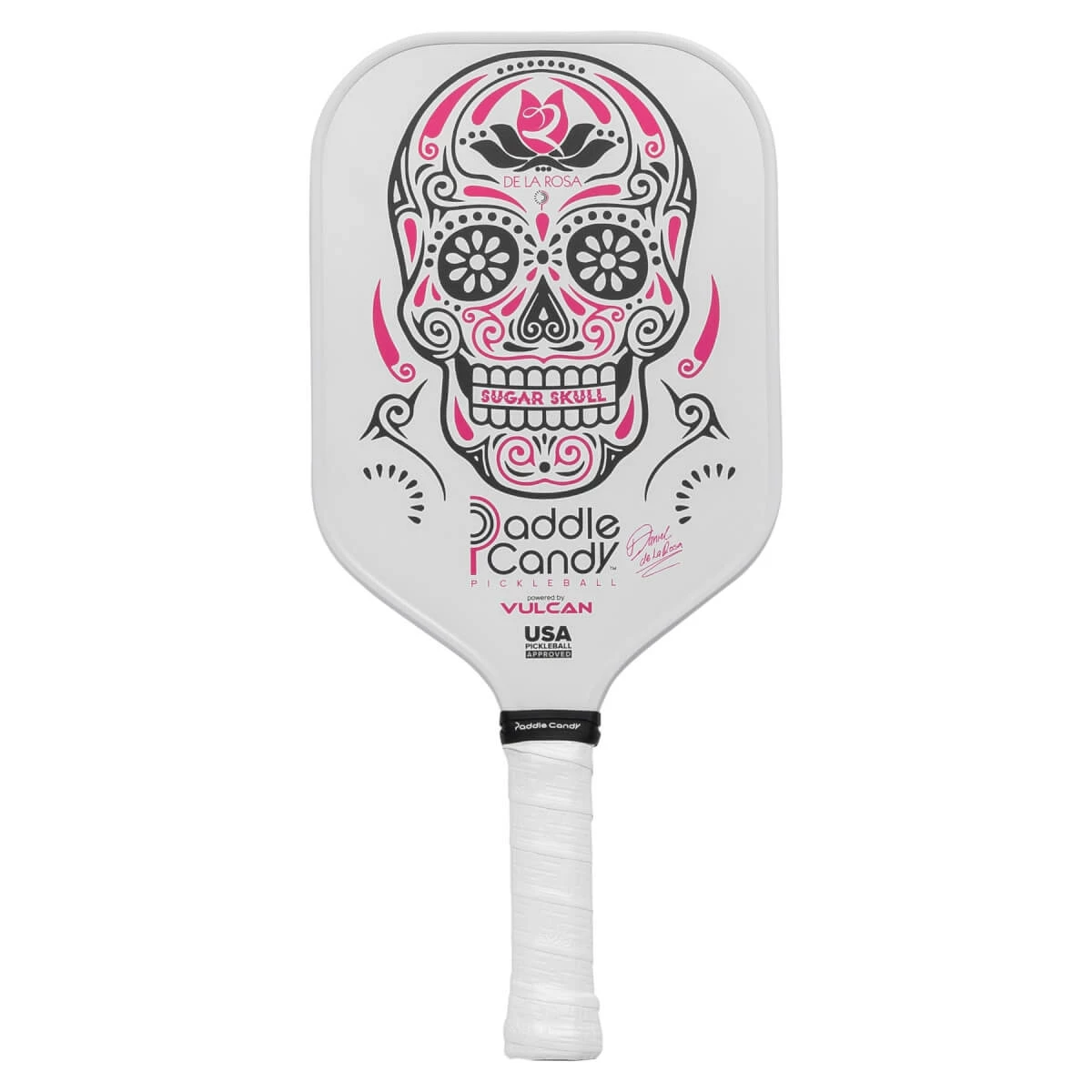 The Vulcan Paddle Candy Daniel De La Rosa Heavyweight Composite Pickleball Paddle features the colorful “Sugar Skull” artwork that complements its versatile and touch-centric benefits. Made in partnership with highly-ranked professional (in both pickleball and racquetball) Daniel De La Rosa, this design uses Vulcan’s popular shape with an elongated handle and tapered neck to allow for a large range of of shots and an aerodynamic feel. The artwork and De La Rosa rose to serve as an homage to Daniel’s Mexican heritage.